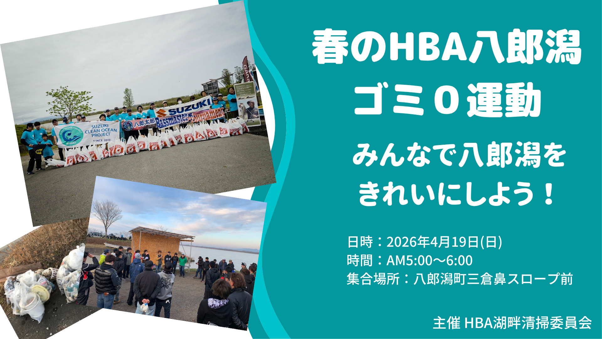 今年も「あきたビューティフルサンデー」に合わせ、春のHBA八郎潟ゴミ0運動を開催いたします。 日時:2026年4月19日(日) 時間:AM5:00~6:00 集合場所:八郎潟町三倉鼻スロープ前 ※ゴミ袋は準備しますが手袋やデレキ等は各自準備して下さい。 今年もみんなで八郎潟をきれいにしましょう! みなさん、ご参加ご協力よろしくお願い致します! 主催 HBA湖畔清掃委員会 協力 八郎潟町役場 HBA湖畔清掃委員会より